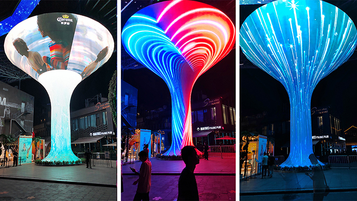 這塊異形LED顯示屏由上海智彩專案定制,高達(dá)12米,面積達(dá)113.4平方米。獨(dú)特的造型,絢麗的顯示效果,光與影交匯,聲與色齊聚,給人以非常震撼的感官體驗(yàn)。